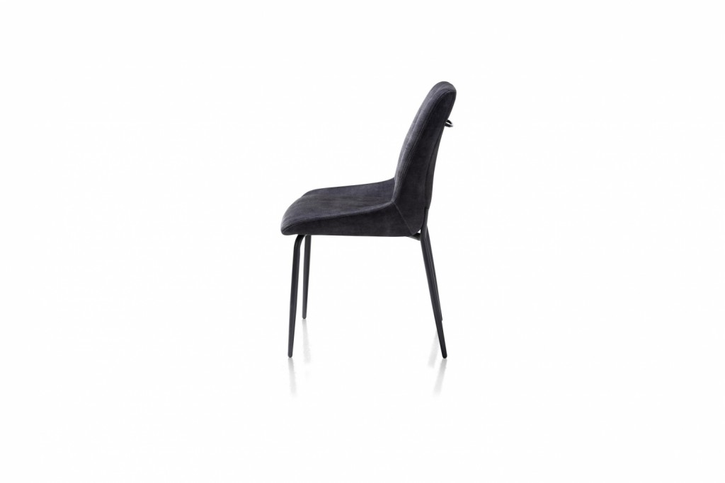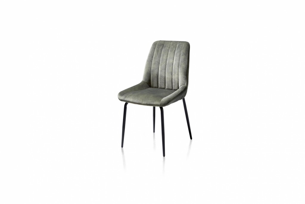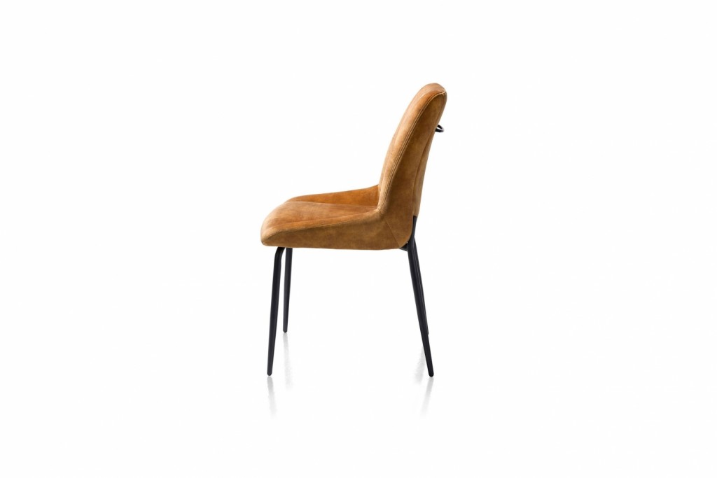 Eetkamerstoel Remon van het merk Happy@Home is bekleedt met de stof Kares. Deze stof en de zwart metalen poten maken de stoel opvallend door de stiknaden en met een eigentijds design. Door het handvat wat op de stoel zit is de stoel makkelijk te verplaatsen.
