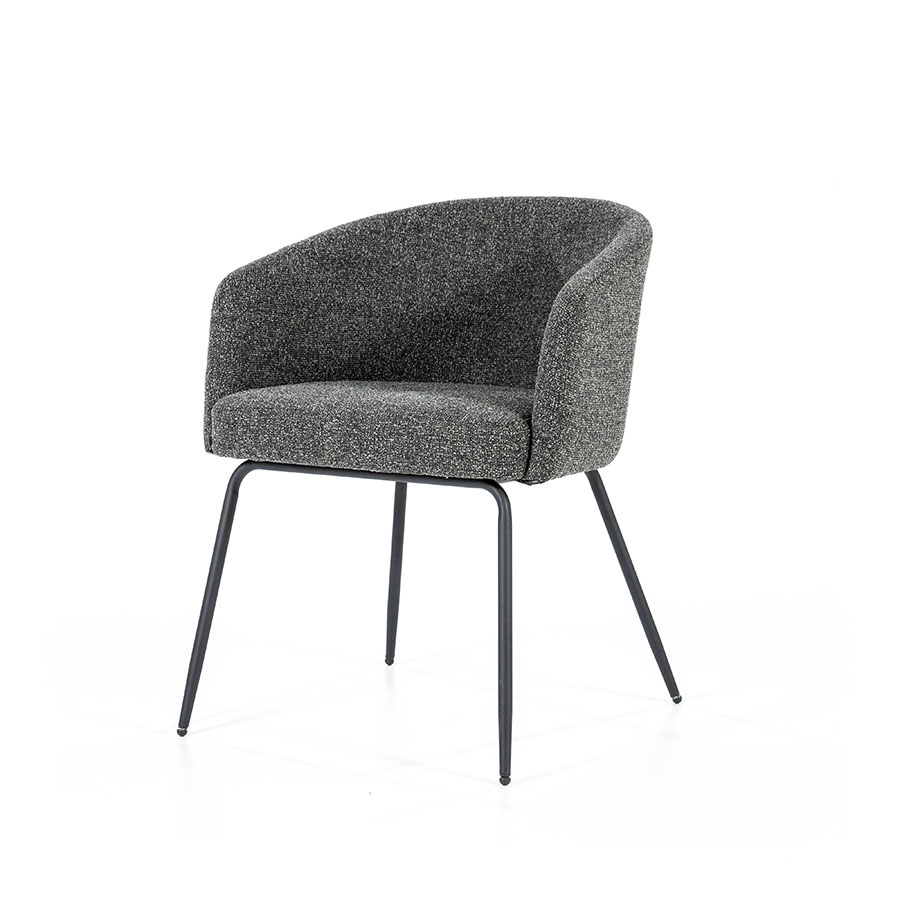 De antraciet kleurige stoel met armleuning heeft een mooi design.