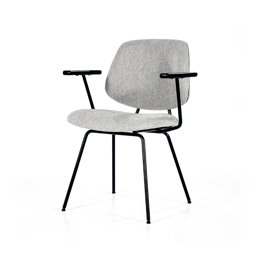 De grijze stoel met armleuning heeft een mooi design dat past bij een modern of scandinavisch interieur.