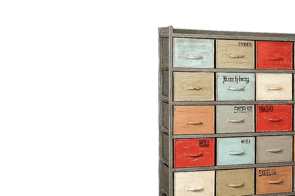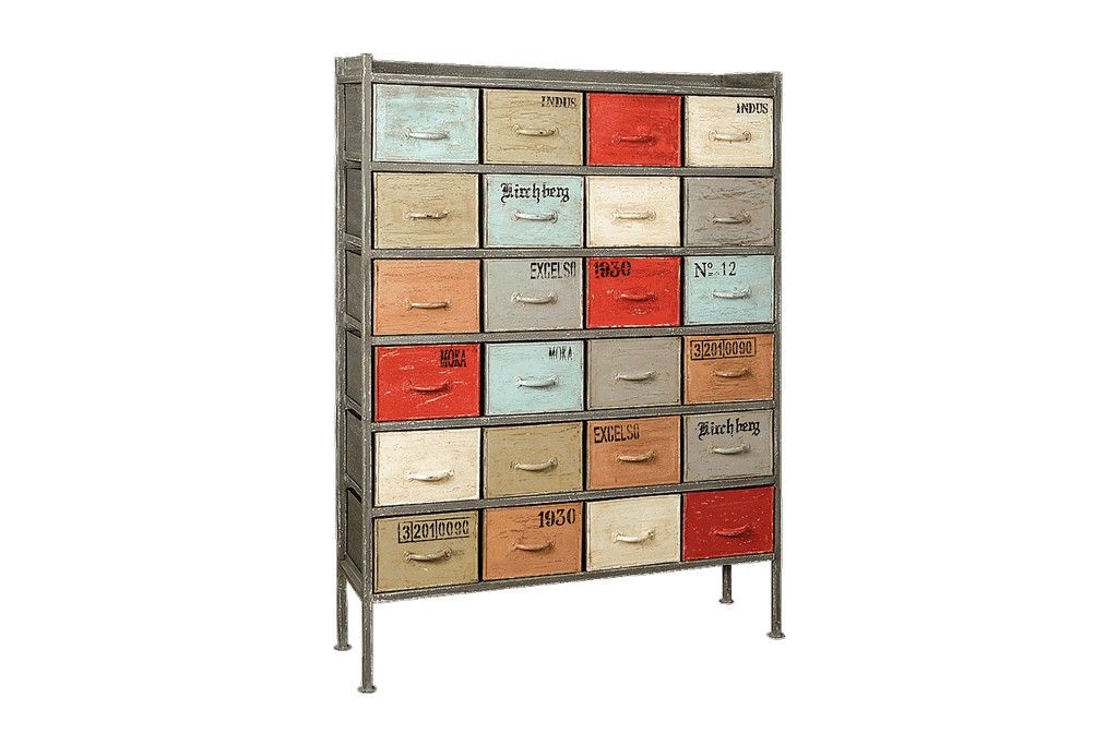 Deze ladenkast heeft 24 laatjes. Hoofdkleur:multicolor