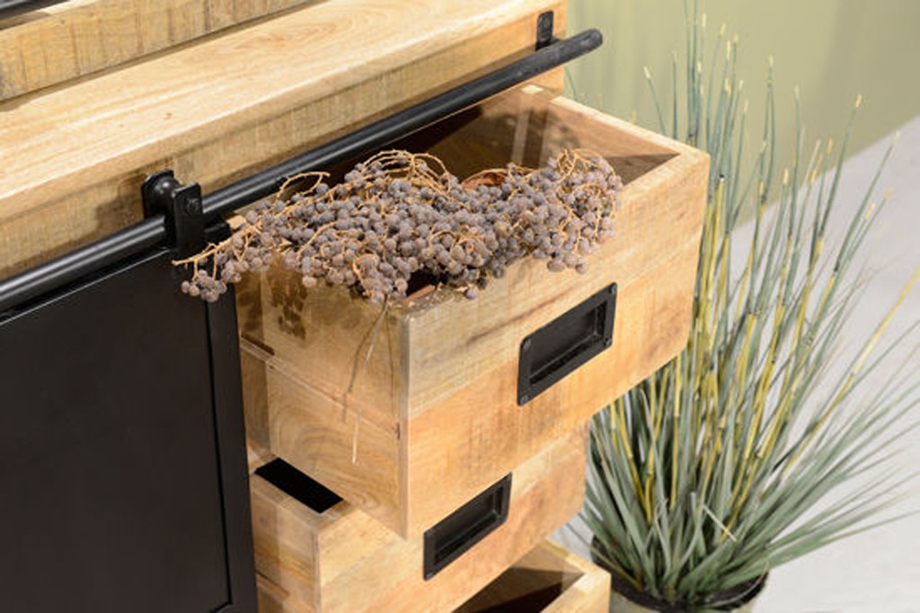 De Noah buffetkast is een massief houten kast gemaakt van mango hout in combinatie met metaal. De kast beschikt over schuifdeuren wat praktisch is in het gebruik. De Noah buffetkast is met vele stijlen te combineren en zorgt voor sfeer in huis. Vaak is deze kast uit voorraad leverbaar maar voor actuele levertijden informeert u via de winkel.