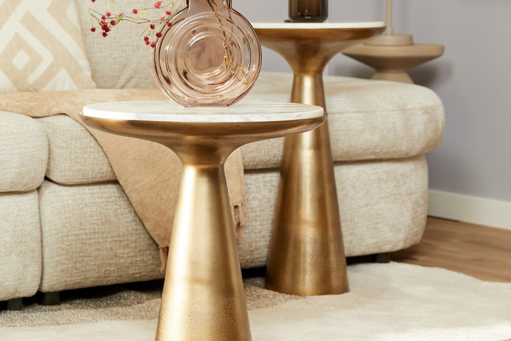De bijzettafel Essy is er in de Large en Small uitvoering. Het blad is van wit marmer. Het onderstel is van metaal en met een gouden finish afgewerkt.