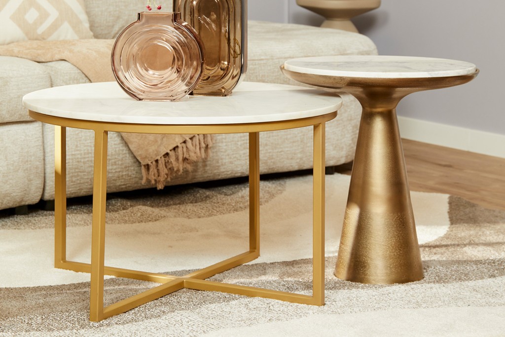 De bijzettafel Essy is er in de Large en Small uitvoering. Het blad is van wit marmer. Het onderstel is van metaal en met een gouden finish afgewerkt.