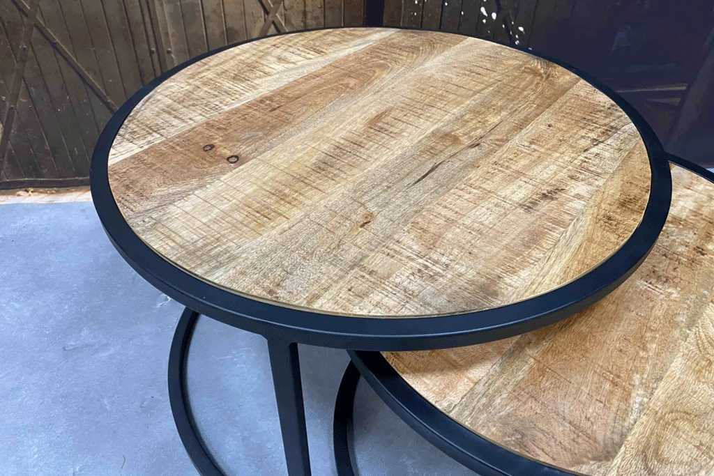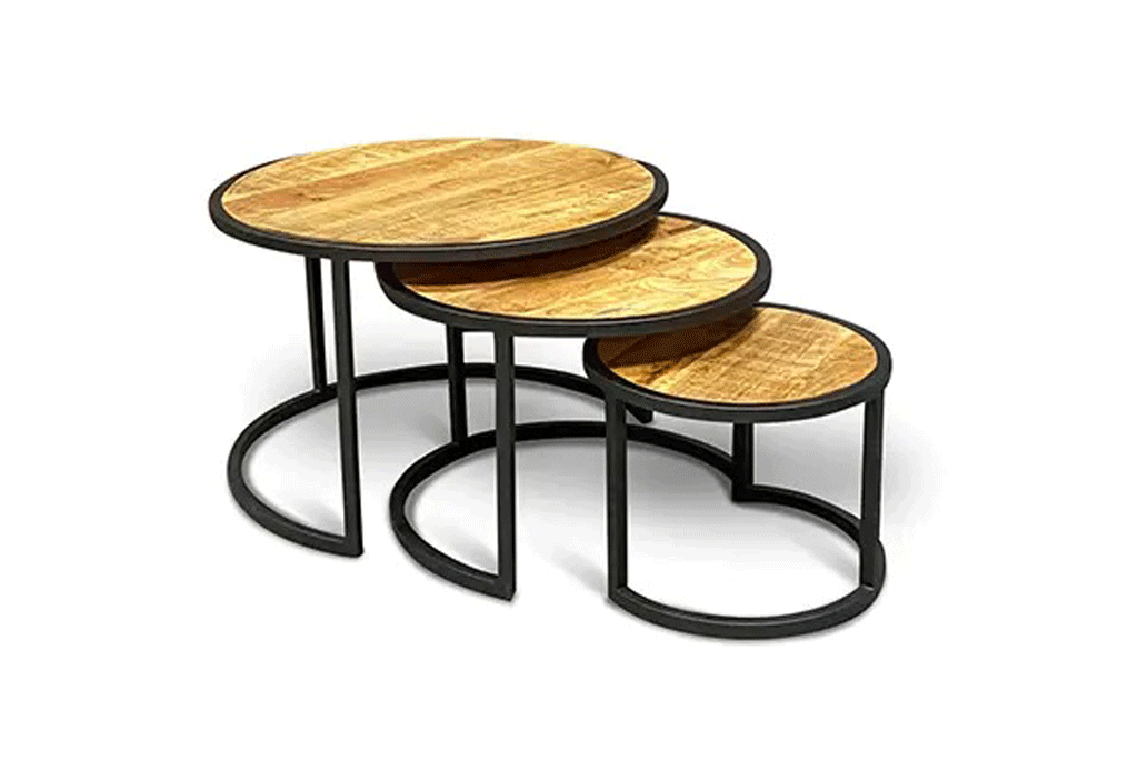 De Noah salontafel set een leuke set van drie mango houten salontafels. Deze set heeft als extra detail een zwarte metalen rand om elk blad.